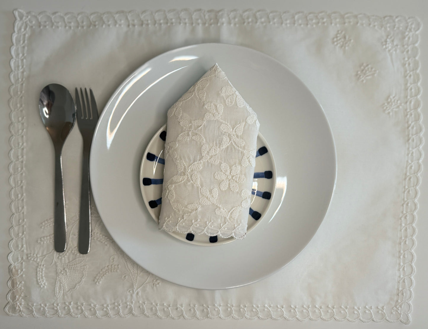 Set of 6 Hand Embroidered White Cotton Napkins that perfectly complement all table linens. Chikankari, the hand embroidery technique comes from Lucknow, the ‘city of nawabs.’ These beautiful table linens are a 100% machine washable and can be bleached too!